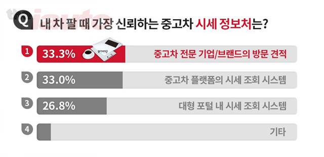 ‘내 차를 팔 때 가장 신뢰하는 곳은 어디인가’라는 질문에 기업에서 제공하는 전문적인 방문 견적 서비스에 대한 신뢰도가 33.3%로 가장 높게 나타났으며, 중고차 거래 온라인 플랫폼에서 제공되는 시세 서비스도 33%로 비슷한 수치를 보였다. 뒤이어 네이버의 ‘MY CAR(마이카)’, 카카오내비 ‘내차 시세조회·내차팔기’ 등 대형 포털의 서비스가 26.8%를 차지했다.