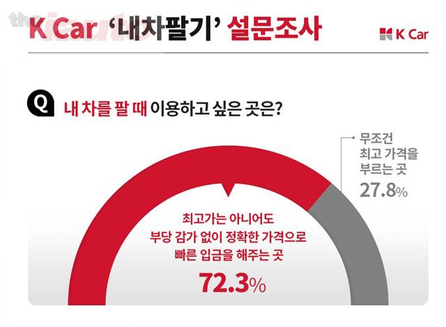 국내 최대 직영중고차 기업 K Car(케이카)는 내차팔기를 주제로 온라인 설문조사를 실시한 결과, 내 차를 중고로 팔 때 최고 매입가보다 정확하게 가격을 책정하고 빠르게 입금해주는 매매업체를 선호하는 것으로 조사됐다고 7일 밝혔다.