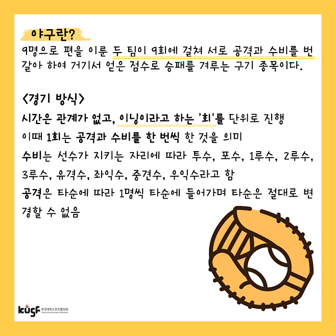 [KUSF = 이유선 기자] 코로나 19로 미뤄졌던 올림픽. 흥미로운 점은 올해 개최 예정이지만 공식명칭은 2021 도쿄 하계올림픽이 아닌 2020 도쿄 하계올림픽이다. 오늘은 33개 종목 중 하나인 다시 돌아온 반가운 얼굴, ‘야구’에 대해 알아보려 한다.