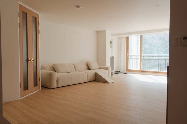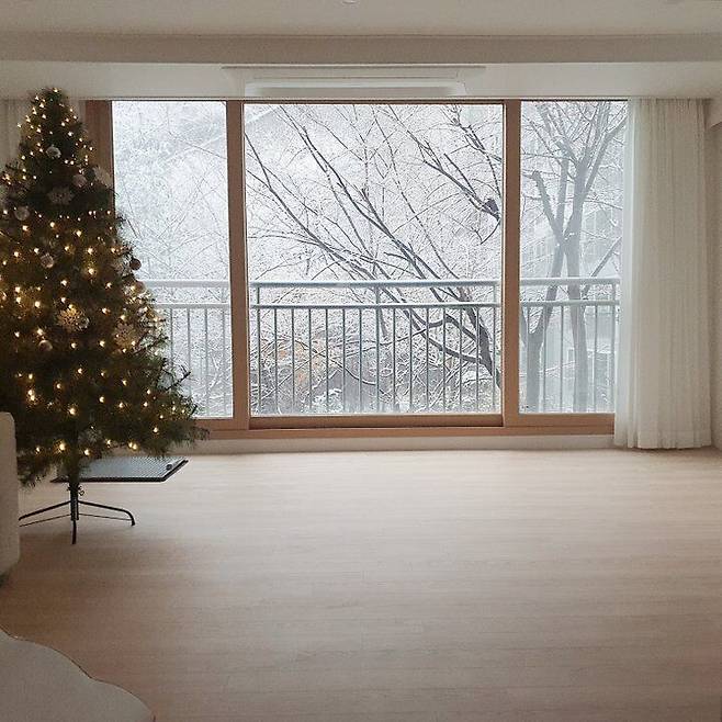 광폭 베란다의 특징을 살려 거실은 확장을 진행했어요. 마운틴 뷰라 집에서 계절을 느낄 수 있는 점이 제일 만족스러워요. 지난겨울 눈이 펑펑 오던 날은 마치 겨울 왕국에 와 있는 듯한 느낌을 받기도 했었답니다.