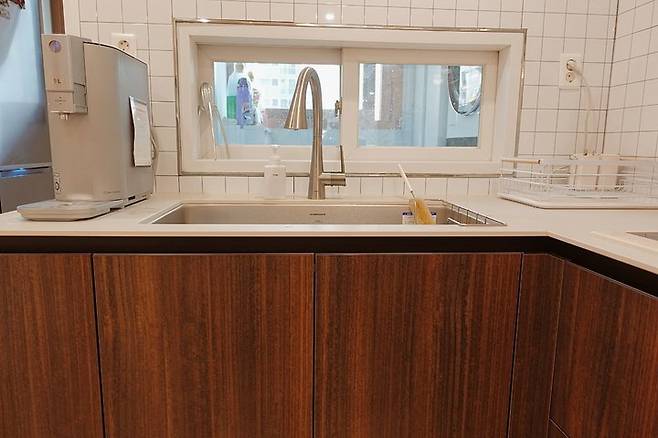 정수기 설치에 애를 많이 먹었어요. 상판이 세라믹이라 정수기 서비스 센터에서 타공이 어렵다고 하더라고요 ㅠㅠ 인테리어 업체에서 조심스럽게 타공해서 어렵게 설치한 정수기를 숨길 곳을 찾지 못한 점이 제일 아쉬워요. 정수기 렌털 기간이 지나면 꼭 작고 더 예쁜 친구로 바꿀 거예요.