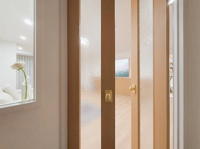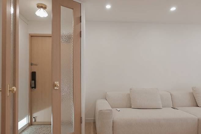 중문은 외부 소리에 민감한 반려견을 위해 꼭 해줘야지 했던 부분 중 하나에요. 박스 형태의 중문은 투박해 보여 신랑과 의견을 제일 많이 나누었던 공간이에요. 중문을 열었을 때 화장실이 보이는 건 절대 안 된다는 공통적인 의견으로 대각선으로 낸 중문이 아주 마음에 들어요.