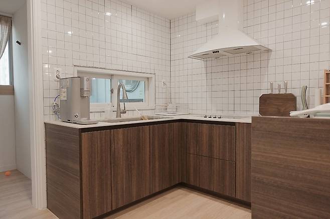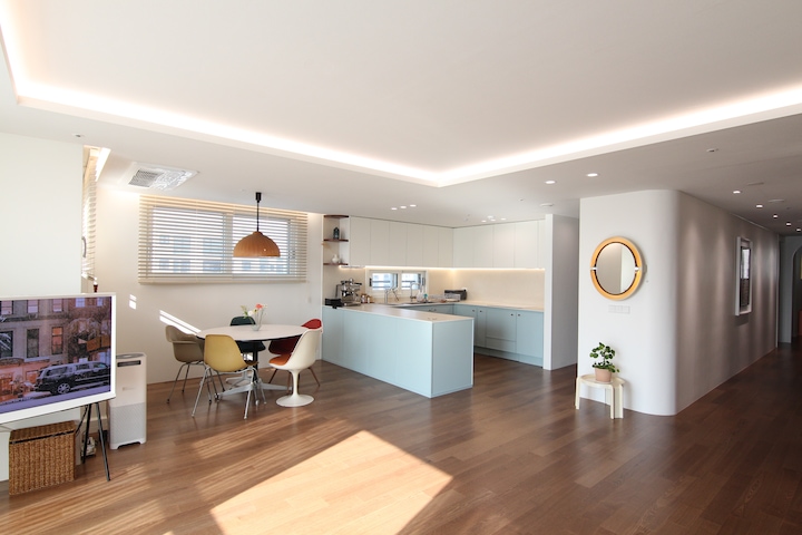 미니멀함을 살리기 위해 과감하게 상부장은 설치하지 않았고, 기존의 ㄱ자형 주방에서 동선이 좋은 ㄷ자 주방으로 변경하였어요.