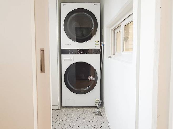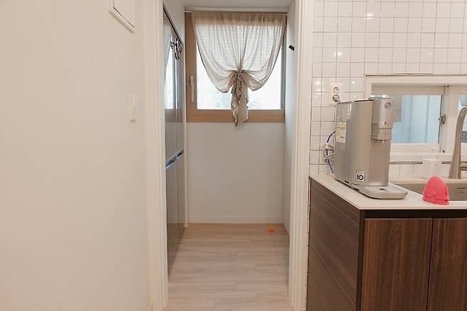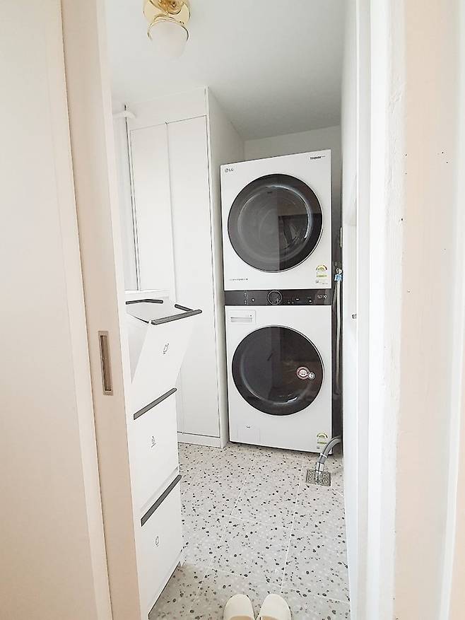 원래 구상은 식재료 넣을 곳을 만들려고 했어요. 기존 세탁실을 안방 베란다 쪽으로 바꾸려고 했는데, 온수 연결이 어렵다고 안내를 받아 어쩔 수 없이 주방 뒤쪽이 세탁실이 되었어요.