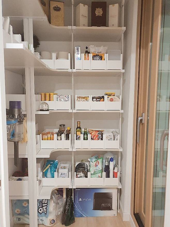 이 집에는 숨겨져 있는 공간들이 참 많았는데요. 에어컨 실외기가 설치되어 있는 작은 창고 공간을 펜트리로 활용하기 위해 장을 짜 맞췄어요. 인터넷에서 쉽게 찾을 수 있는 업체에 직접 실측해서 장을 짰는데 아주 딱 떨어지게 맞춰져서 기분이 좋았어요.