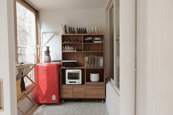 광폭 베란다를 활용하기 위해 가벽을 만들고 미닫이문을 만들었어요. 상부장이 없는 주방이지만, 요리를 즐겨 하기 때문에 접시나 주방기구들 보관할 곳이 필요했거든요. 나중에는 집안으로 들어올지도 몰라 따뜻한 우드톤의 찬장을 들여 주방기구와 접시를 보관하고 있어요.