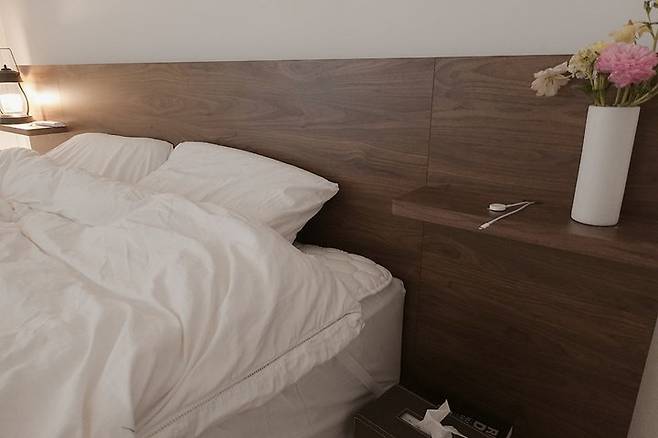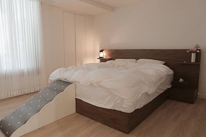 월넛 톤을 기본으로 두고 발품을 팔아 우리집에 딱 맞는 가구를 들여왔어요. 침대에서 반려견이 함께 수면을 하기 때문에 침대는 최대한 큰 더블 킹사이즈, 호텔식 느낌이 나는 가구로 선택했어요.
