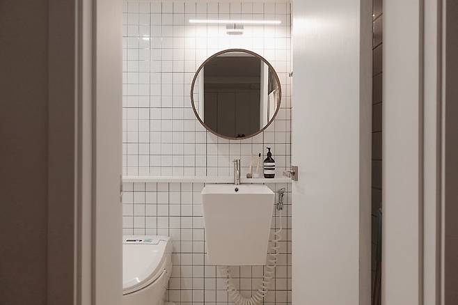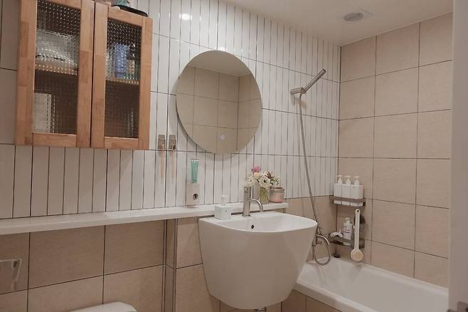 화이트 톤의 모자이크 타일을 사용해서 전면을 모두 뭍여주었어요. 우드톤의 수납형 거울로 포인트를 주었는데 딱 한공간에 제가 좋아하는 것이 모여있는 느낌이에요.
