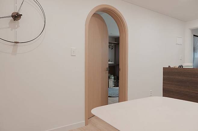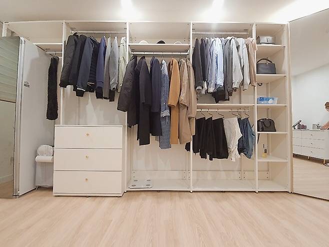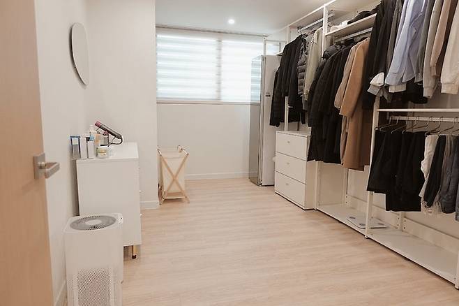 방이 3개라 좋은 점은 드레스룸을 꾸밀 수 있는 거예요. 출근 시간이 다른 부부라 아침잠에 방해를 받지 않도록 드레스룸을 별도로 만들어 출근 준비를 할 수 있도록 했어요.