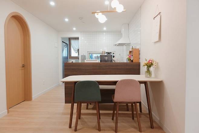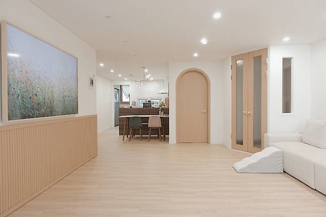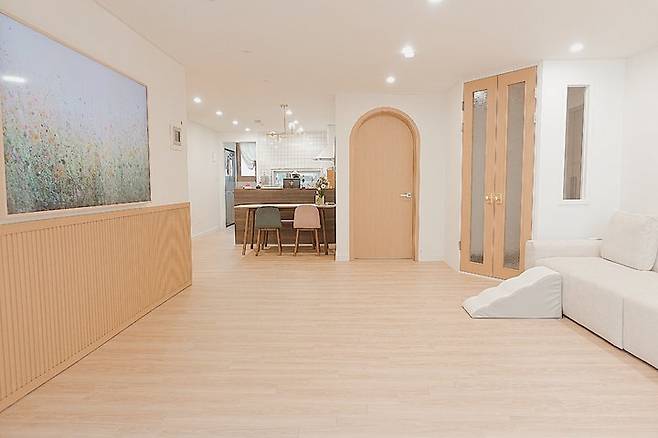 벽지는 페인트로 칠 한 듯한 느낌의 벽지를 사용했어요. 마음에 드는 벽지를 고르지 못해 결국 천장에 주로 사용하는 벽지를 선택했는데 아주 잘한 것 같아요. 또 반려견이 있어 최대한 미끄럽지 않은 바닥을 고르는 게 제일 관건이었어요. 원목의 느낌을 살린 강마루를 시공했는데, 나무결이 느껴지는 마루라 덜 미끄러워 안심이 되는 부분이에요.
