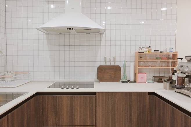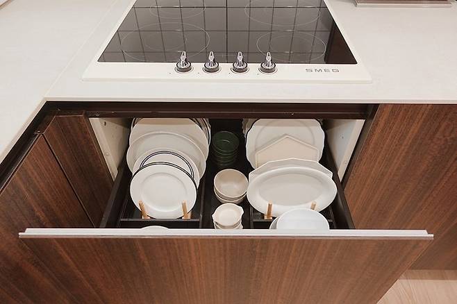 상부장이 없는 주방이라 자주 사용하는 접시와 조리도구는 모두 서랍으로 넣었어요. 깔끔해서 좋은 점도 있지만, 가끔 접시나 주방도구를 찾지 못해 모든 서랍을 열 때는 선반을 더 놓아야 할까라는 생각이 들기도 해요.