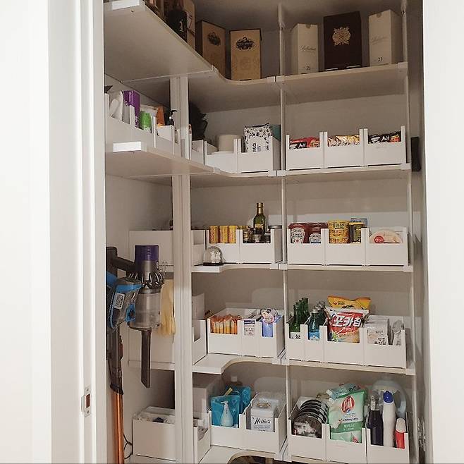 미리 공간을 구성할 때 청소도구를 넣어둘 생각으로 전기선을 빼놨어요. 리모델링 하실 때 꼭 도배 전 전기선을 어디 어디 뺄지 미리 구상을 하셔야 해요. 모듈 구성할 때 한쪽에 길게 자리를 남겨두어 청소기까지 깔끔하게 정리해 주었어요.