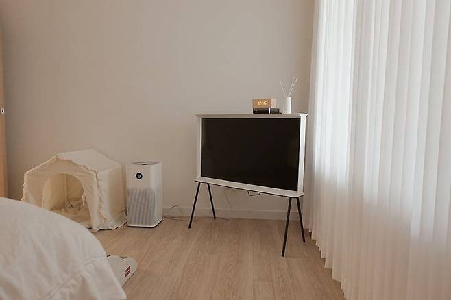 침실에서 거의 TV를 보는 편이 아니지만, 가끔 스포츠 채널을 보겠다는 신랑과 의견 충돌이 있을 때 활용되는 공간이에요. 가전도 예뻐야 한다는 생각으로 신혼 때 구입한 셰리프 TV는 시간이 지난 지금 보아도 참 예뻐요.