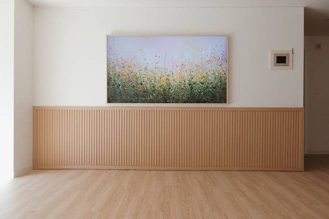 페인트를 칠한 듯한 화이트 벽지와 우드 아트월을 제작하여 갤러리 느낌이 들 수 있도록 했어요. 더 프레임 TV의 대기 화면을 그림으로 설정할 수 있다는 점을 활용했어요. 덕분에 계절마다 액자를 바꾸지 않아도, 정기 구독을 하고 있는 갤러리 서비스를 이용해서 분위기를 바꿀 수 있으니 좋더라고요.