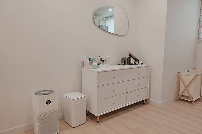 제일 신경 쓰지 못한 화장대에요. 서서 출근 준비를 하는 우리에게 의자가 들어가는 화장대보다는 수납 위주의 화장대가 적합하다고 생각했어요. 그에 맞게 거울도 조금 큰 사이즈를 준비했어야 하는데, 밸런스가 맞지 않아 아쉬움이 제일 큰 부분이에요.