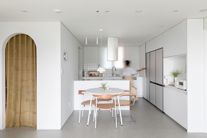 보조주방에 있던 빌트인으로 맞췄던 냉장고를 그대로 가지고 왔어요. 한샘에서 틀을 맞추어 원래 냉장고 자리였던 것처럼 딱 들어맞게 들어갔어요. 냉장고 앞쪽으로는 가벽과 슬라이딩 도어를 설치해 런드리 룸을 만들어 주방과 장소를 구분했어요.