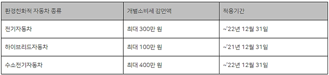 온실가스 감축 및 대기환경을 개선하기 위해 정부에서는 여러 방면으로 친환경 자동차를 지원하는데요. 구입 시에는 개별소비세 감면 정책 있습니다.