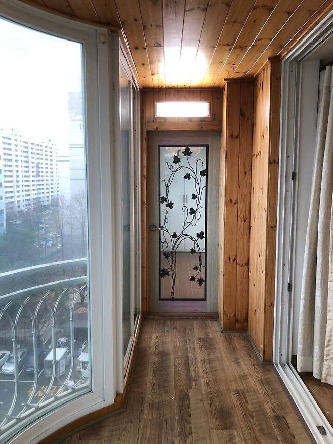 이곳은 뒷베란다이자 저희 집 창고예요. 방화문은 모루 유리로 포인트를 줬어요. 베란다에 있는 수납장들은 기존에 있던 거를 살려 문짝만 필름 시공하고 손잡이만 교체했습니다. 필름 시공만 했는데 완전 새 것처럼 보여요.