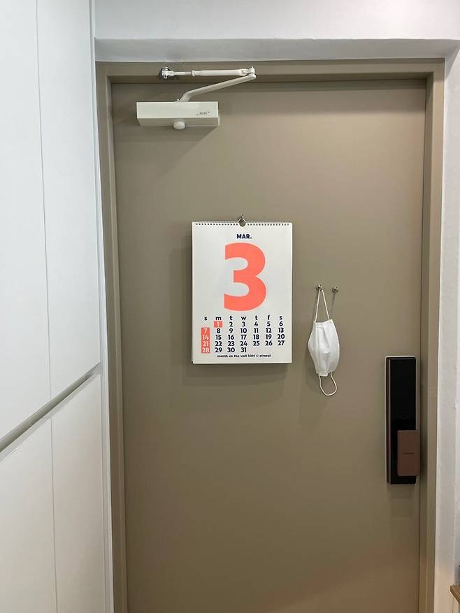 현관문은 베이지색으로 필름 시공을 했습니다. 원래 밝은 색으로 하고 싶었으나 도어 스토퍼 쪽이 신발 자국으로 쉽게 더러워질까 봐 베이지로 골랐는데 전체적으로 화이트 톤인 집 분위기와 잘 어울려서 잘했다고 생각하는 것 중 하나입니다. 현관문에는 달력과 매일 쓰고 있는 마스크를 걸어두었습니다.