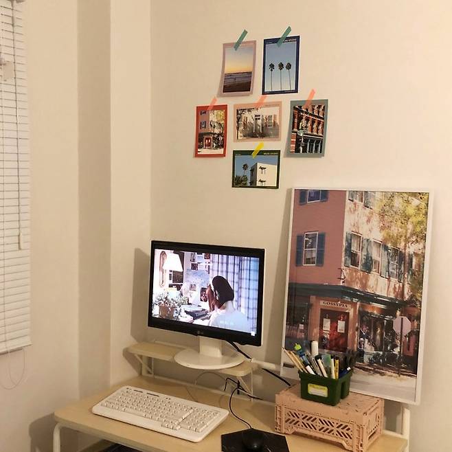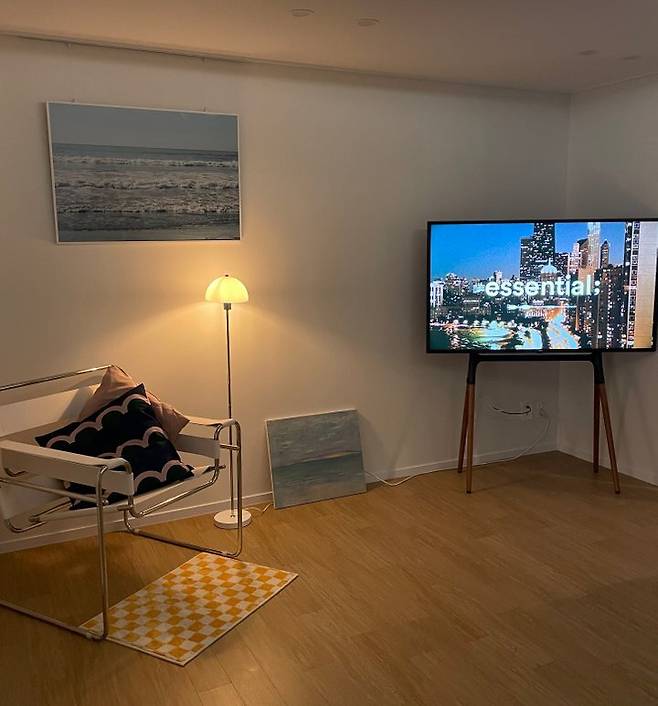 TV 옆에는 저만의 공간을 꾸며보았어요. 저희 부부는 바다를 좋아해서 파도 포스터를 걸어 놓았습니다. 저희 부부는 취향이 달라서 마음 맞는 물건 고르기가 어려운데 이 포스터는 저희 마음에 쏙 든 사진이에요. 요즘에는 아기 낮잠 재우고 여기에 앉아서 커피 한잔 마시는 게 유일한 낙이랍니다.