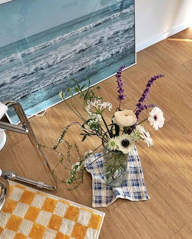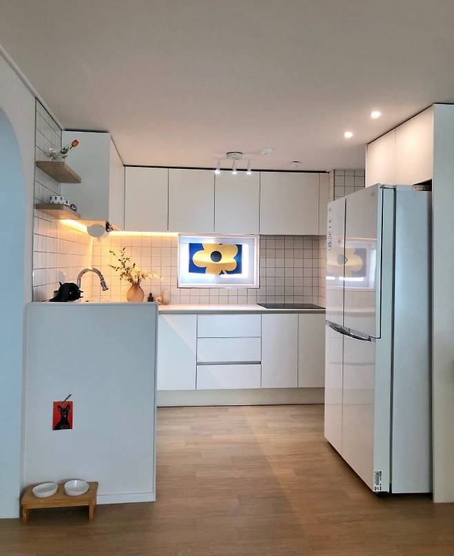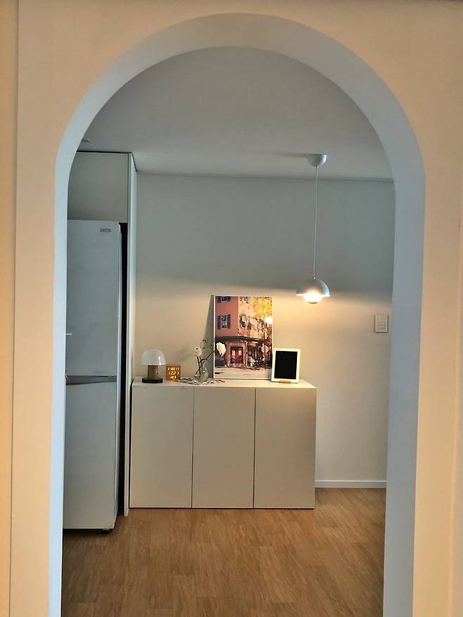 냉장고 옆에는 아이엔지 수납가구를 놓고 그 위에는 저만의 포토존을 만들었어요. 꽃을 좋아해서 주기적으로 꽃을 사서 기분전환을 하고 있습니다. 밤이 되면 주로 이곳에만 불을 켜고 있는데 집안 분위기가 너무 좋아 보여요.