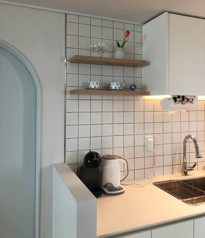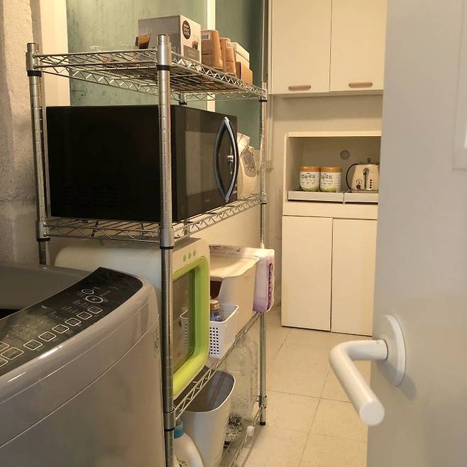 저는 살림살이가 별로 없을뿐더러 밖으로 꺼내지 않고 눈에 보이지 않게 수납하는 걸 좋아해서 매일 사용하는 전기포트와 커피 머신만 제외하고 전자레인지, 밥솥 등 잡다한 살림은 뒷베란다에 놓았어요.