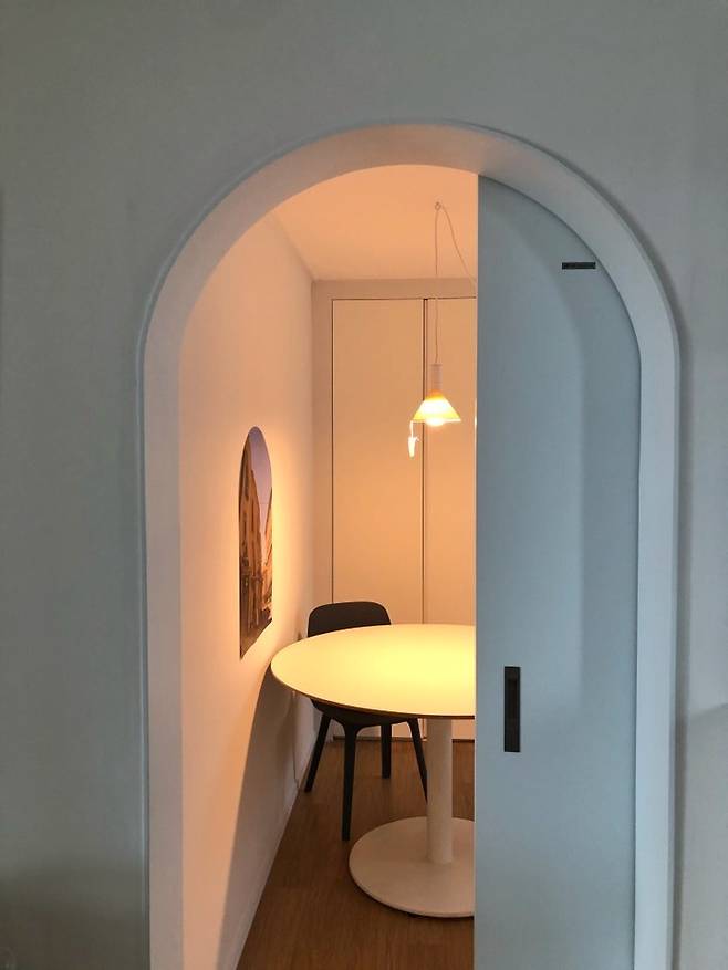 저희는 식탁, 컴퓨터, 드레스룸이 다 있는 이 공간을 멀티룸이라고 불러요. 기존에 있는 붙박이장은 살리고 문짝만 교체했어요. 그리고 알루미늄 블라인드를 설치했습니다. 문은 아치로 시공을 했는데요 공간 분리를 할 수 있도록 슬라이딩 도어를 설치했습니다.