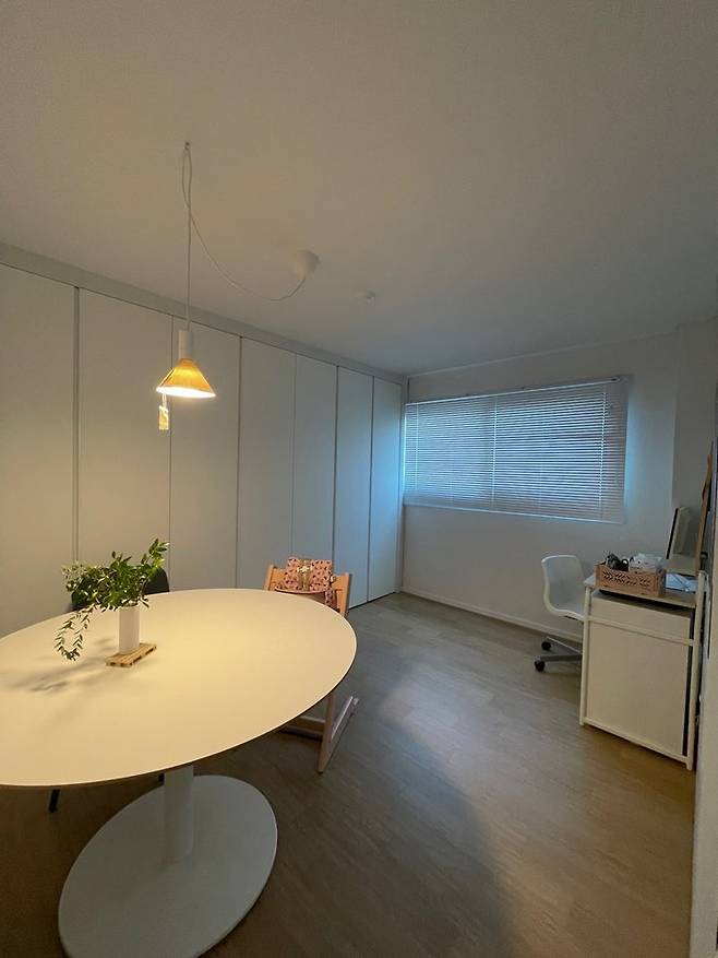 아치 도어와 원형 테이블 공간이 이뻐서 주방 갈 때마다 흐뭇해져요ㅎㅎ 식탁 뒤 창가에는 컴퓨터 책상을 놓았습니다.