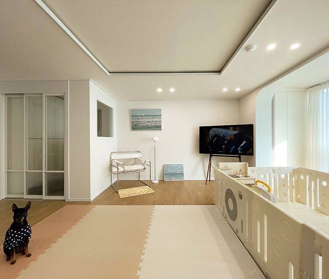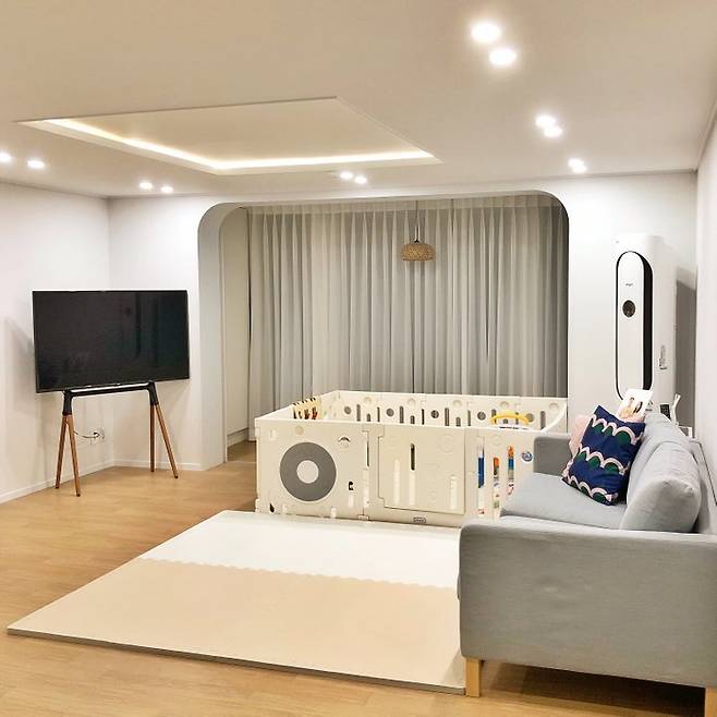 제일 최근에 찍은 거실 모습이에요. 이사 와서는 베이비룸을 설치하기 싫었는데 한창 기어 다니는 아기가 있는 집은 역시나 베이비룸이 필수인가 봐요. 그래도 도노도노 베이비룸은 디자인이 깔끔해서 거실과 잘 어울리는 것 같아요.