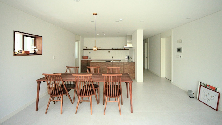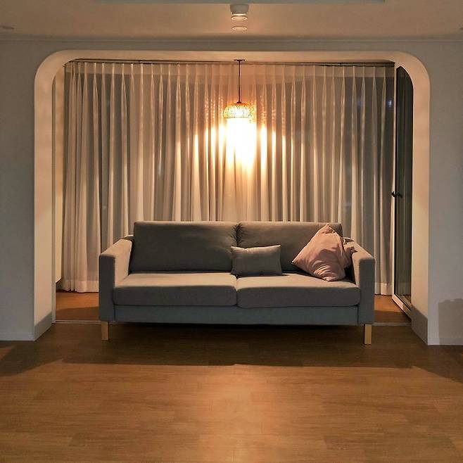 기존의 올드한 느낌의 거실에서 화이트 거실로 탈바꿈했어요. 철거할 수 없는 내력벽은 아치로 포인트를 주었습니다. 베란다는 확장하는 대신 화이트 폴딩도어를 시공했어요. 내력벽 뒤로 폴딩도어를 숨길 수 있어서 확장한 느낌이 나요.