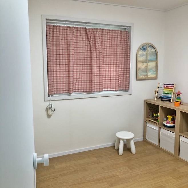 아기방 벽지는 친환경 에덴바이오 참솔로 시공했습니다. 사진에는 잘 안 담기지만 실제로 보면 페인트를 칠한 질감이 참 이뻐요. 헤이버터 핑크 커튼도 벽지와 잘 어울리네요.