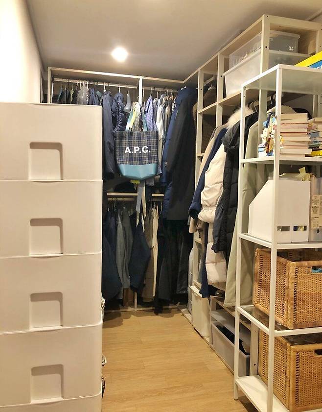 시스템 행거는 이사하면서 어디에 놓아야 할지 고민이 많았습니다. 그러다가 안방을 나눠서 가벽 안쪽으로 수납하면 괜찮을 것 같은 생각이 떠올랐고 가벽은 시스템 행거 길이에 맞게 세웠습니다. 그리고 잡다한 살림살이들을 이곳에 감출 수 있어서 가벽 세운 것에 대해 너무 만족하고 있어요.