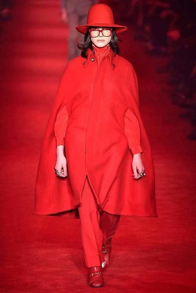 남성 모델들이 속이 훤히 비치는 시스루와 꽃무늬, 러플, 리본. 오프 숄더 등 남성에게 금기시됐던 스타일을 입고 무대에 등장했으며 반면 여성 모델은 과장된 어깨선을 강조한 파워수트 등 남성 같은 매니시(mannish) 룩을 선보이며 런웨이를 누볐다.