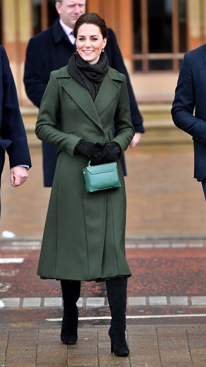 12. 2018년 2월 윌리엄 왕자와 선더랜드를 방문한 임신 7개월인 케이트 미듵턴은 돌체& 가바나의 그린 코트를 입었다.