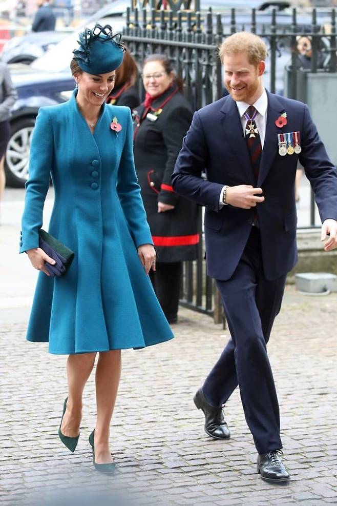2. 지난 4월 25일 시동생 해리 왕자와 함께 런던 웨스트민스터 사원에서 열린 '안작 데이' 기념 예배에 참석한 케이트 미들턴은 캐서린 워커의 청록색 코트에 같은 색조의 패시네이터를 매치했다.