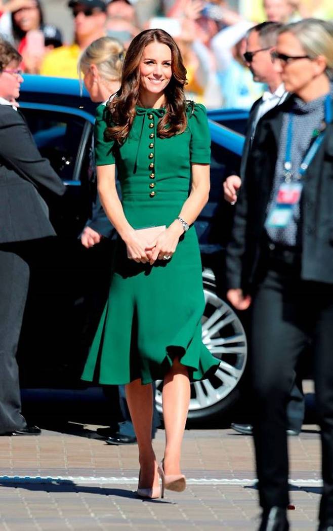 18. 2016년 9월 캐나다로 로얄 투어 중 캘로나 대학을 방문한 케이트 미들턴은 나비 리본과 청동 단추가 돋보이는 그린 드레스를 입었다.