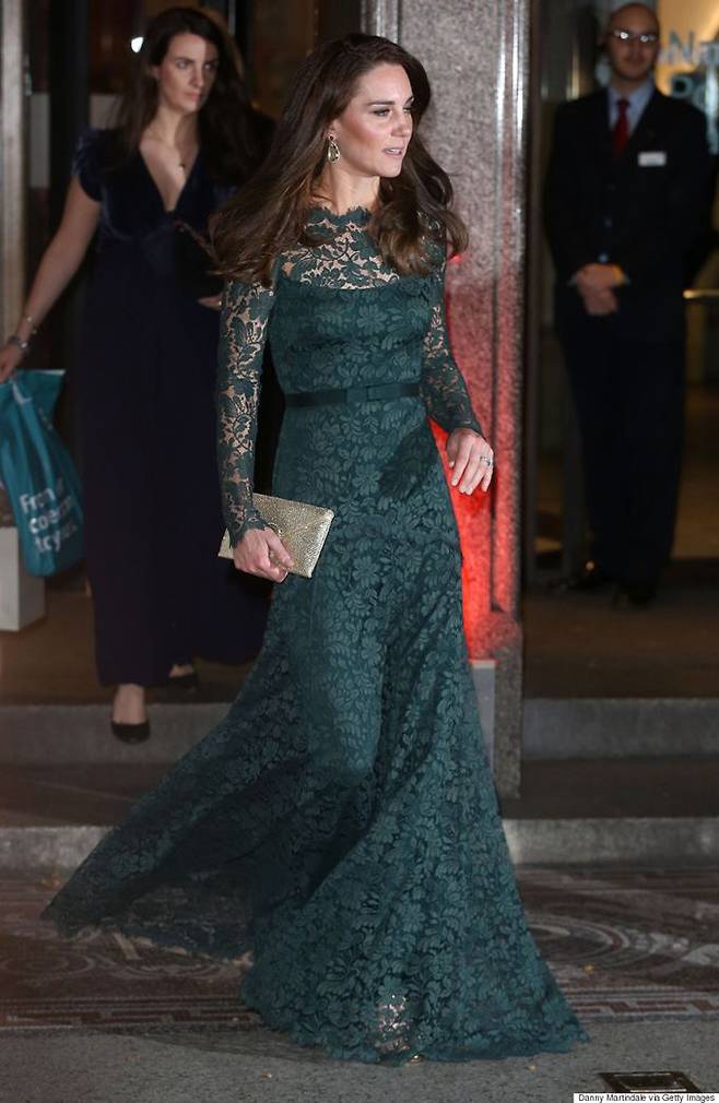 16. 2017년 3월 런던의 국립 초상화 갤러리에서 열린 갈라 디너에 참석한 케이트 미들턴은 바닥까지 끌리는 그린 레이스 드레스를 착용했다.