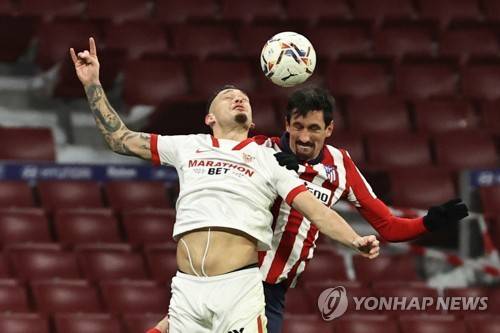 epa08933941 Atletico Madrid's defender Stefan Savic (R) jumps for the ball with Lucas Ocampos (L) of Sevilla during a Spanish LaLiga soccer match between Atletico Madrid and Sevilla FC in Madrid, Spain, 12 January 2021. EPA/JUANJO MARTIN