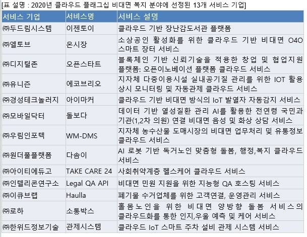 네이버클라우드는 과학기술정보통신부와 한국지능정보사회진흥원(이하 NIA)이 추진한 '2020년 클라우드 플래그십 비대면 복지 분야'에 선정된 13개 서비스 기업을 대상으로, 비대면 복지 분야 SaaS 서비스 개발 및 사업화를 완료했다고 20일 밝혔다.