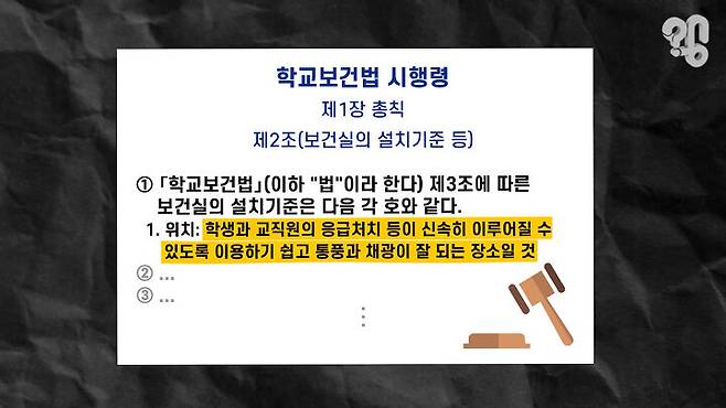 그래서 “보건실은 왜 꼭 1층에 있는지 알아봐달라”는 의뢰에 대한 취재를 하기 전 ‘1층에 보건실을 둬야한다’는 규정이 있는 줄 알았다