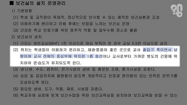 충북 충주 오석초등학교의 ‘보건실운영계획’에는 ‘학생들이 이용하기 편리하고, 채광․통풍이 좋은 곳으로 학교 건물 출입구 쪽이면서 남향이며 1층 중간’에 보건실을 설치하는 걸로 나와 있다.