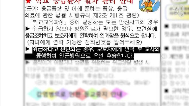 특히 위급하다고 판달 될 경우 보건실에 머물다가 보호자와 교사가 119구조대와 함께 병원으로 후송하도록 돼있다.