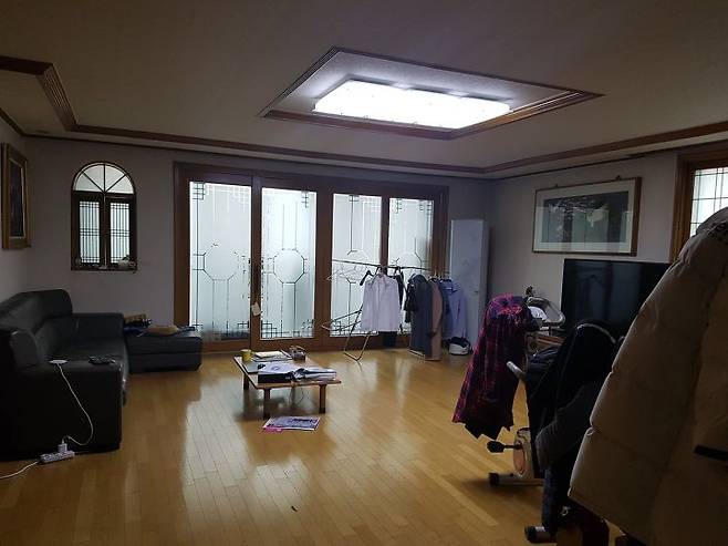 공사 전 거실 모습입니다. 정리 전 모습이라 어수선하지만 깔끔히 정리하면 널찍한 매력이 있었어요.