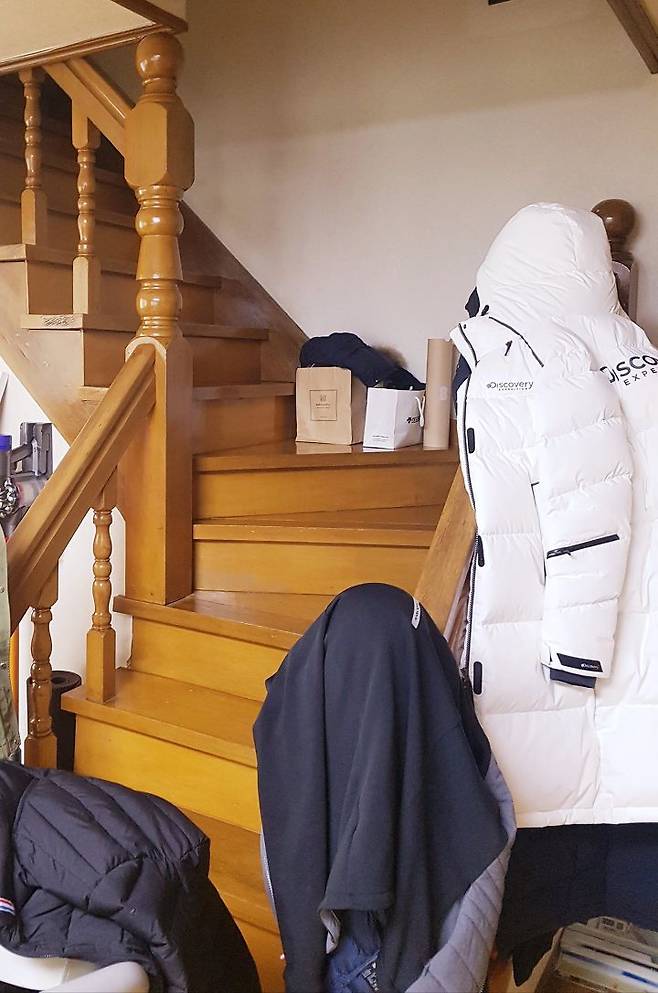 옥탑방으로 가는 계단입니다. 난간을 옷걸이처럼 사용해서 어수선한 모습이죠?
