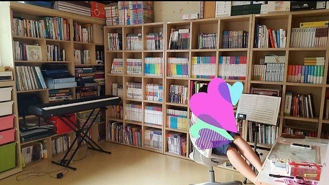 딸 아이가 악기를 배우고 있어서 전자 피아노와 보면대가 있고, 그 옆에 책장, 책상, 행거를 뒀어요. 기존에 가지고 있던 가구인데 다행히 방과 세트처럼 잘 어울려요.