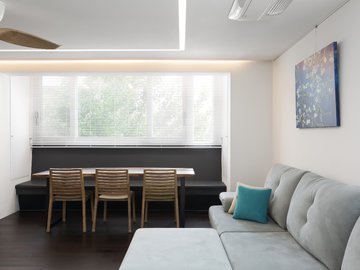 앞 베란다는 확장하며 전창을 반창으로 만들었어요. 거기에 붙박이 벤치를 제작하고 220cm 우드슬랩을 둬서 카페 같은 거실을 만들었습니다.