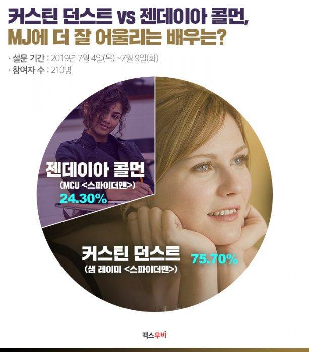그렇다면 관객의 생각은 어떨까. 맥스무비는 7월 4일(목)부터 7월 9일(화)까지 ‘커스틴 던스트 vs 젠데이아 콜먼, MJ에 더 잘 어울리는 배우는?’라는 주제로 설문을 진행했다. 총 210명이 응답에 참여했다. 약 75.7% 관객은 커스틴 더스트가 연기한 MJ를 택했다. 젠데이아 콜맨이 연기하는 MCU ‘스파이더맨’ 속 MJ가 더 마음에 든다고 응답한 관객은 24.3%였다.