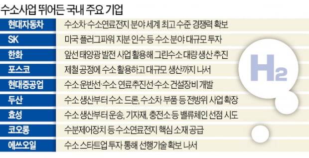현대중공업은 수소 운반선, 수소 연료 추진선, 수소 건설장비 등의 개발에 나섰다. 두산은 연료전지, 액화수소 생산, 수소 드론 등의 사업화를 빠르게 진행하고 있다. 효성은 수소충전소 건설과 연료탱크 개발, 액화수소 생산을 추진 중이다.