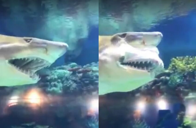 수족관에 있는 상어가 입을 벌리고 있었습니다.