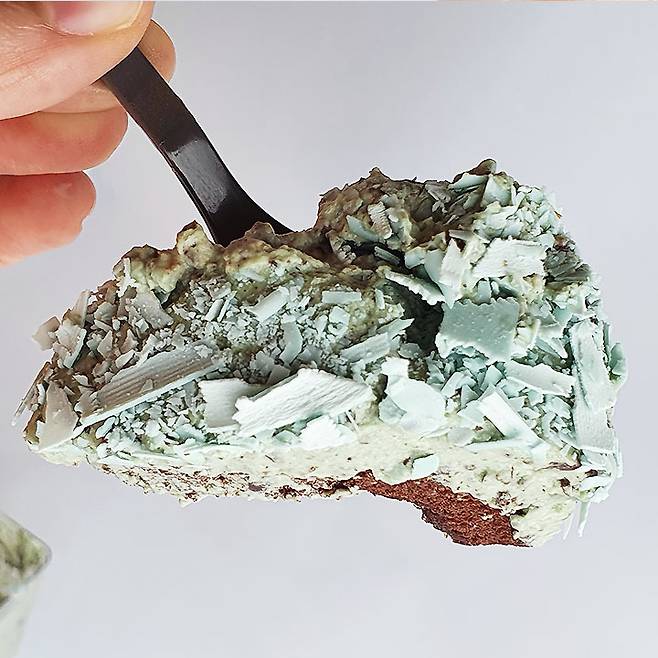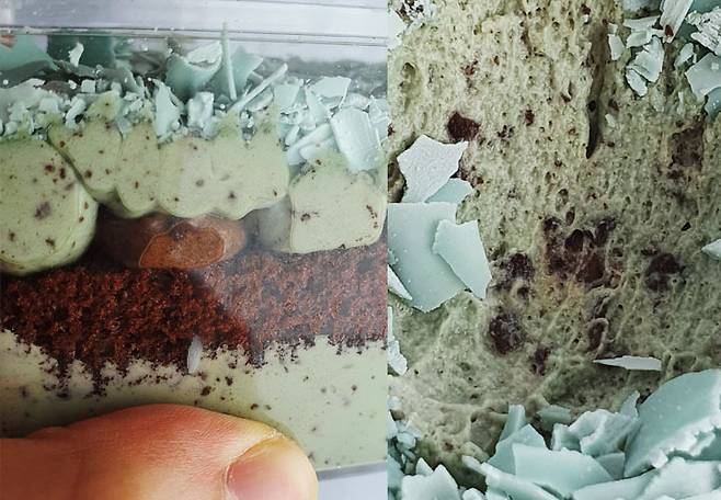 수저로 조심조심 떠서 단면을 살펴볼게요. 민트 크림 2단, 그 사이에 초코케이크 시트가 있고. 영롱한 민트 초콜릿 이 눈처럼 소복이 쌓여있는 비주얼~ 떠먹는 케이크이다 보니 빵보다 크림의 비중이 더 많네요.